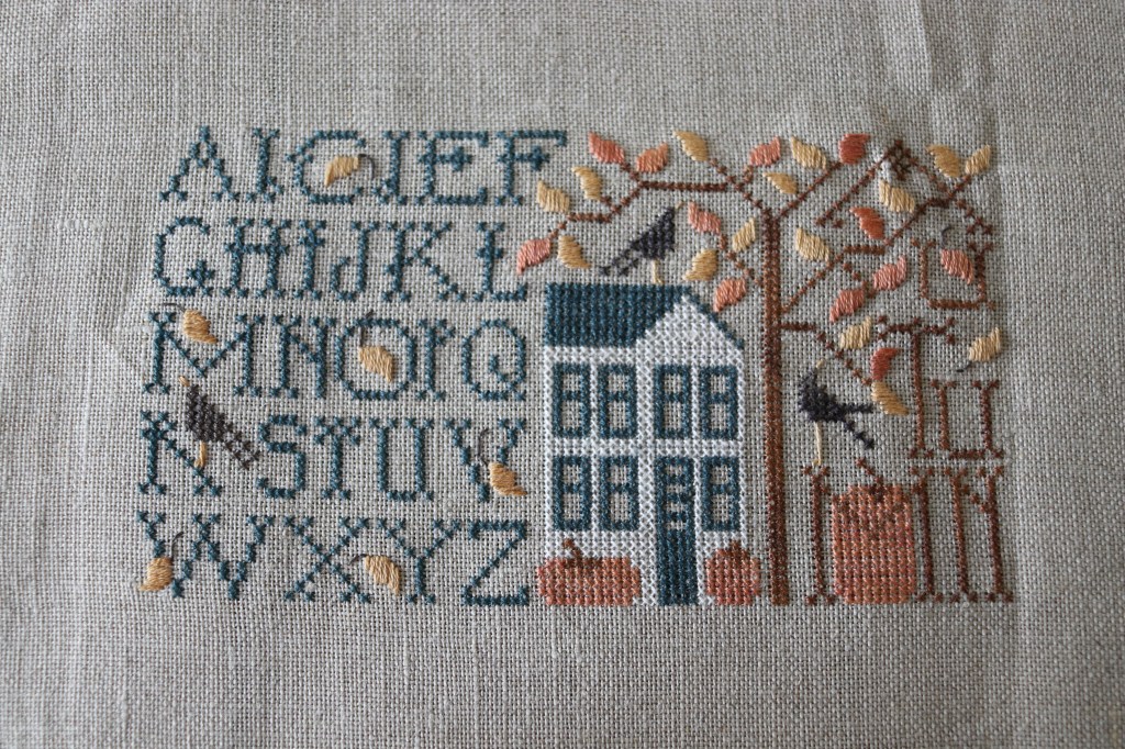 I started this one to stitch along with OIivia of Pumpkin Hollow Quilts. She stitches on a Autumn piece every Wednesday with another friend of hers! I, of course, fell horribly behind as I was distracted by knitting projects. However I do love this pattern and hope to finish it this year! This was the first project that I only bought the pattern for and then picked my own linen and floss from my stash. That was quite the fun (small) adventure.