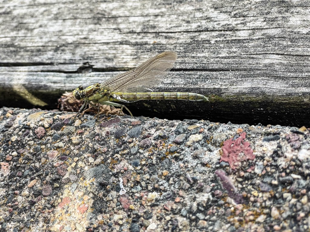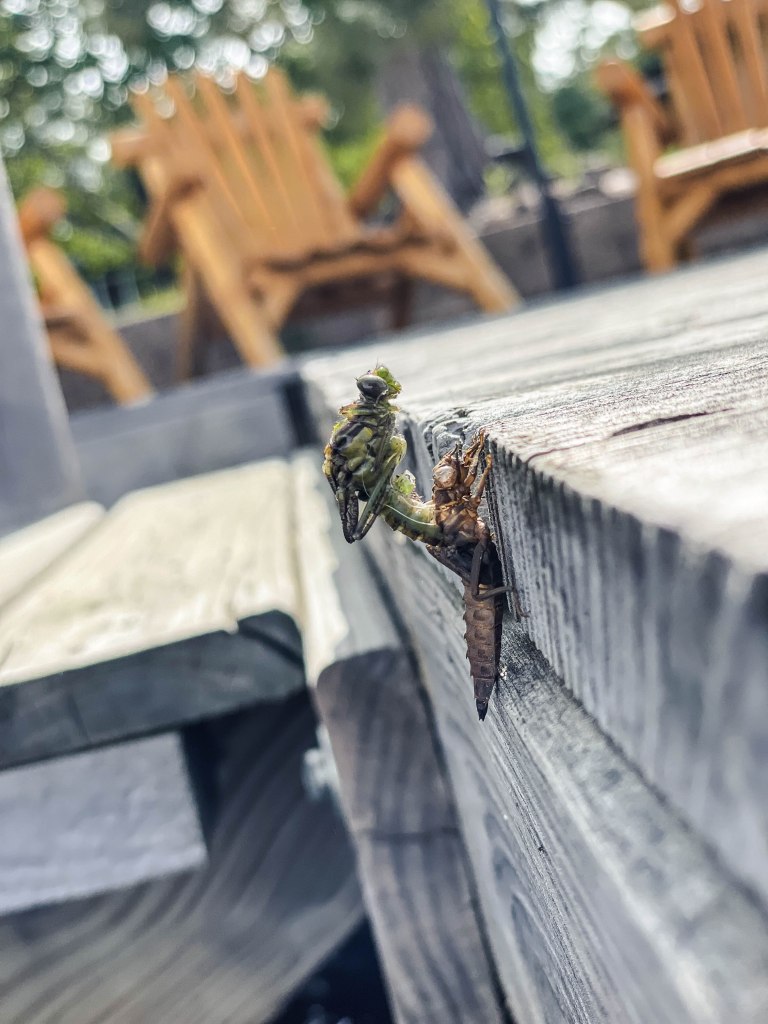 I had never been in the north woods in June before. It turns out that it is the time when all the dragonflies come up from the lake to molt and finally get their wings! It was crazy for us. It started out with me noticing just one…and then another…and another….and ANOTHER. They were everywhere on the deck and pier! It was so magical (ok, and a little creepy) to watch them emerge and spread their wings! It takes about three hours, I have read, for their body to fully harden and dry.