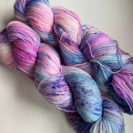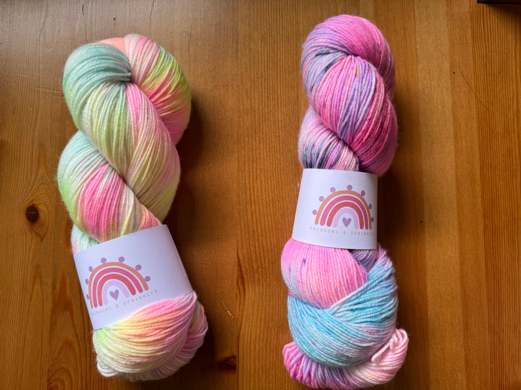 These two are from Rainbows and Sprinkles Yarn. The one on the left is called Enchanted Meadow and the one on the right is called Pink Sapphire. I feel like I wore a lot of nylon track jackets and wind breakers in the 90s. I especially remember a nylon track suit in that ubiquitous 90’s teal color. This color made me think of those jackets. Pink Sapphire is a soft synthwave color to me!
